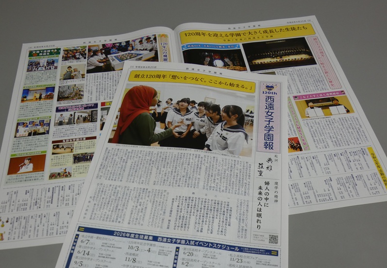 西遠女子学園報、発行! お知らせ 2026.04.28 新聞形式で年1回発行する「学園報」がこのほど完成し、4月25日のPTA総会での配布を皮切りに、皆様にお届けできるようになりました。 1面には巻頭言が、2-3面には2025年度の西遠の歩みが、そして第4面には今春の大学進学成績が発表されています。8名の卒業生のコメントはどれも大学入試を戦い抜いた達成感あふれるものです。 PTA総会の席でも紹介させていただきました。どうぞ皆様、機会がありましたら、この「西遠女子学園報」お手に取ってお読みくださいませ。